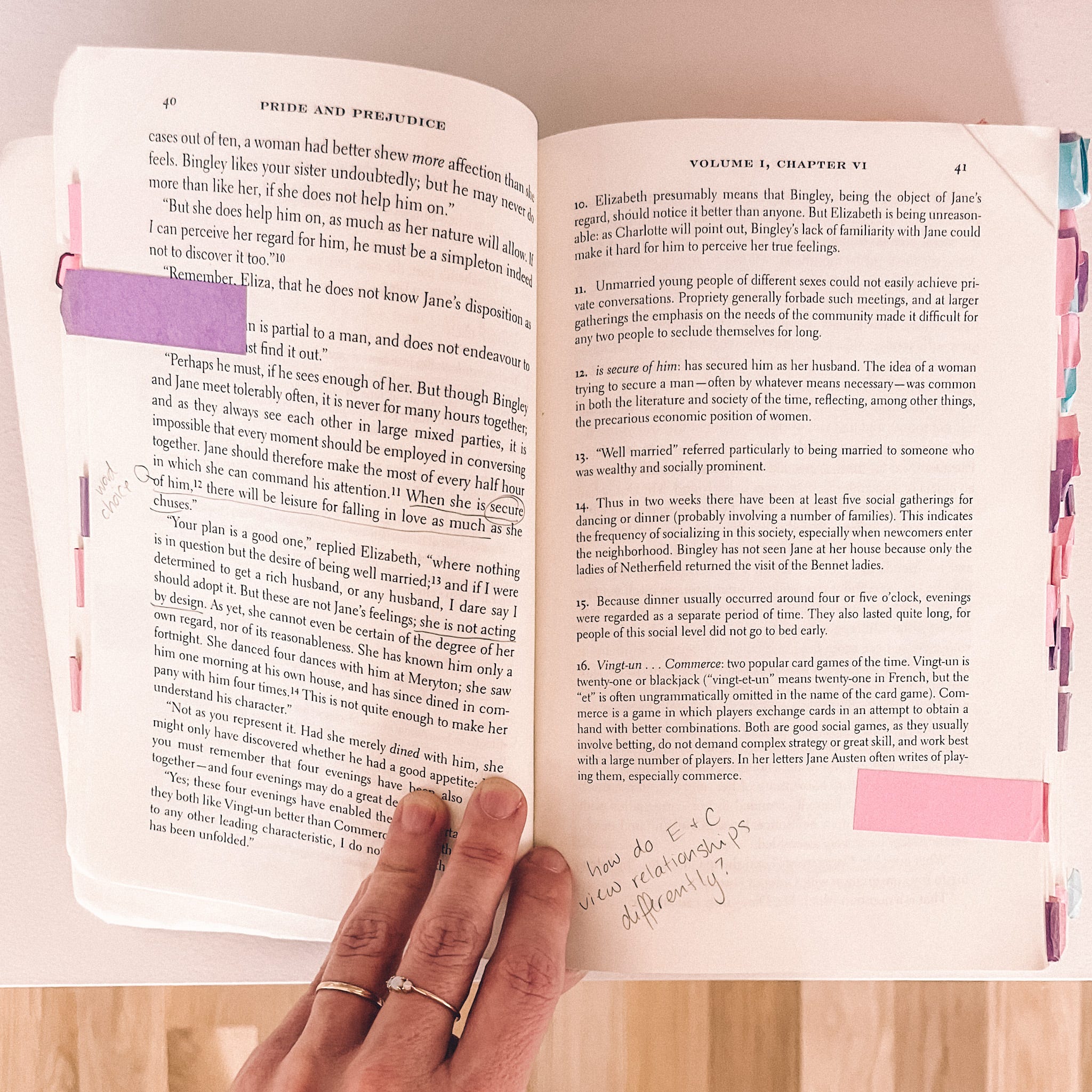 Choose the right book. Not every book is meant to be read deeply and each reader may have a different idea about what books warrant this kind of time and attention. Consider what type of book you want to read deeply. Maybe you want to pour over the pages of the newest Emily Henry book, marking the most swoon-worthy dialogue. Maybe you’d like to carefully read a well-plotted mystery and make note of how the author structured the reveal. Or maybe you, like me, want to explore some literary fiction with an eye for how an author is using writing techniques to develop their themes. There’s no right answer here, but selecting the right book for what you want to explore will help you enjoy the process.